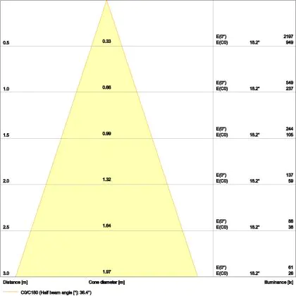 Der Abstrahlwinkel bezeichnet den Winkel, in dem das Licht aus der Lichtquelle ausgestrahlt wird. Er wird in Grad (D) angegeben. Je geringer die Gradzahl des Abstrahlwinkels ist, desto kleiner ist auch der Durchmesser des Lichtkegels, den die Lichtquelle produziert. Beispiel: Wird eine Lampe mit einem Abstrahlwinkel von 60 Grad an der Decke (2,5 m Höhe) angebracht, erzeugt sie einen Lichtkegel von 2,9 Metern Durchmesser. Hat die Lampe hingegen einen Abstrahlwinkel von 120 Grad, beträgt der Lichtkegel 8,7 Meter im Durchmesser. |