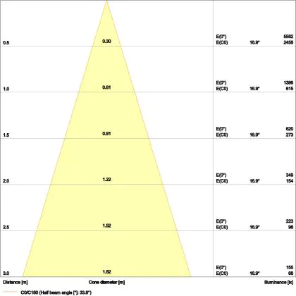 Der Abstrahlwinkel bezeichnet den Winkel, in dem das Licht aus der Lichtquelle ausgestrahlt wird. Er wird in Grad (D) angegeben. Je geringer die Gradzahl des Abstrahlwinkels ist, desto kleiner ist auch der Durchmesser des Lichtkegels, den die Lichtquelle produziert. Beispiel: Wird eine Lampe mit einem Abstrahlwinkel von 60 Grad an der Decke (2,5 m Höhe) angebracht, erzeugt sie einen Lichtkegel von 2,9 Metern Durchmesser. Hat die Lampe hingegen einen Abstrahlwinkel von 120 Grad, beträgt der Lichtkegel 8,7 Meter im Durchmesser. |